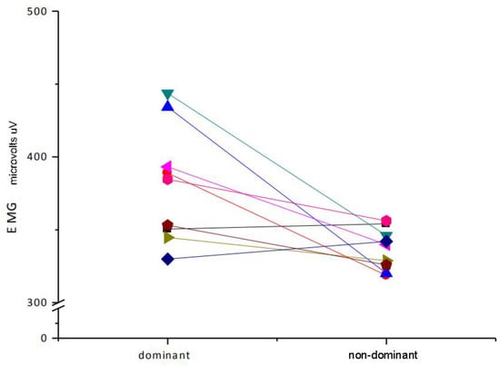 The Mann–Whitney U test showed significant differences (p < 0.01) between the muscle activation of both legs during the attempts. Table 5 presents the average values for each leg. The differences between the legs of the nine subjects are shown graphically (Figure 2).