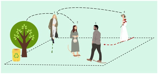 Pedestrian interaction scenario portrayal. Pedestrian 1 observes the surrounding pedestrians and other physical environments while walking. Whether it is a static crowd, like pedestrians 2 and 3, or pedestrian 4 walking in the opposite direction, these factors will influence pedestrian 1 to continuously adjust their trajectory.