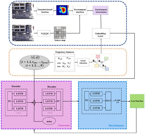 Pedestrian Trajectory Prediction Module: As shown in the pink and blue sections of Figure 2, this module predicts pedestrian trajectories using a GAN framework. The GAN consists of two components: the generator and the discriminator. The generator produces future pedestrian trajectory data, while the discriminator evaluates whether the generated trajectories are authentic. The overall model structure is depicted in Figure 2.