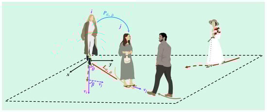where  represents the target pedestrian,  represents the target pedestrian. Their two-dimensional coordinates are  and .  represents the Euclidean distance between pedestrian  and pedestrian , which is used to calculate the influence of repulsive force on the current motion state of target pedestrian,  represents the azimuth relationship between two pedestrians,  represents the motion direction relationship between two pedestrians, and  represents the difference between the pedestrian  and the pedestrian  on velocity.  represents the social vector of pedestrian .