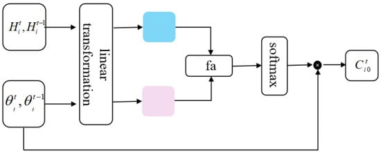 Schematic diagram of attention mechanism. To calculate the influence weights between pedestrians, this paper first computes the similarity between the target pedestrian’s historical states  and the social vectors  with other pedestrians, deriving the influence weights for different pedestrians. All interaction information is then consolidated into the target pedestrian’s social information . In the figure, the blue squares and pink squares represent the information after  and  are processed linearly, respectively.