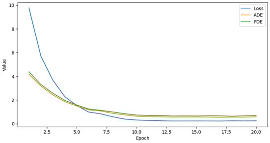 Figure 7 illustrates the training process of the model using the training dataset. It is evident that the model’s loss function decreases as the number of epochs increases, eventually leveling off. Throughout this process, both the Average Displacement Error (ADE) and Final Displacement Error (FDE) metrics also stabilize alongside the loss value. This indicates that the model is learning and adjusting its parameters to make its predictions closer to the true values to gradually reduce the prediction error of the trajectory.