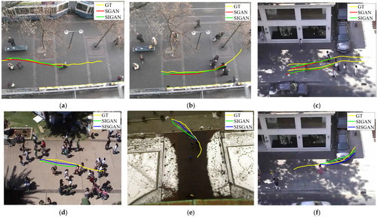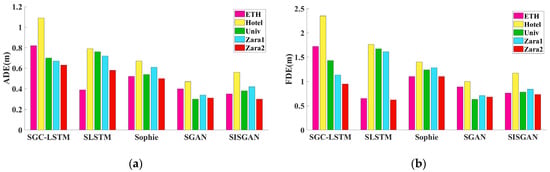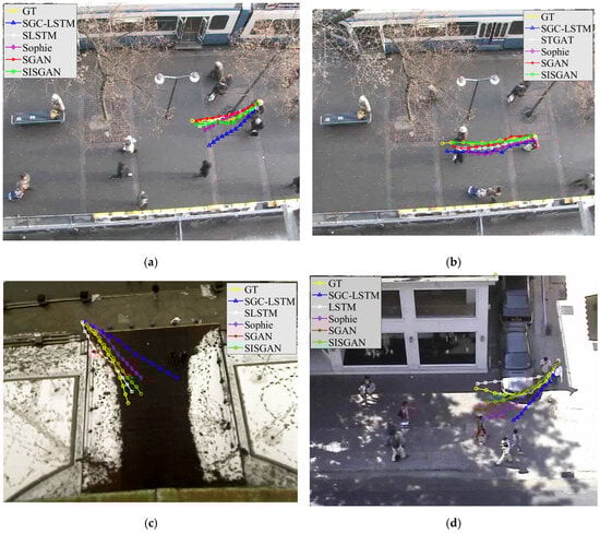 In this study, classical trajectory prediction models including SGC-LSTM [], S-LSTM [], Sophie [], and S-GAN are selected and compared with the SISGAN model. Table 2 presents the comparative findings of the Average Displacement Error (ADE) and Final Displacement Error (FDE) for each method, with measurements expressed in meters. Each row details the prediction error of each model across various dataset scenarios. Notably, the accuracy of the model’s predictions is inversely correlated with the magnitude of the prediction error reflected in the table.