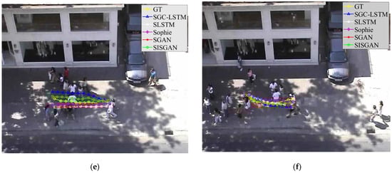 Comparison of trajectory prediction of different models, where (a,b) are from the hotel dataset, (c) is from the ETH dataset, (d) is from the zara1 dataset, and (e,f) are from the zara2 dataset. (a) shows pedestrians avoiding obstacles on both sides; (b) shows pedestrians’ trajectories in a sparse scene; (c) shows pedestrians avoiding snow; (d) shows pedestrians walking along the edges of a car; (e) shows pedestrians adjusting their paths in the face of a stationary, dense crowd to avoid a collision; and (f) shows pedestrians avoiding oncoming pedestrians.