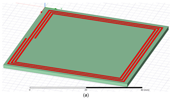 By analyzing the specialized literature in the field for the frequencies under consideration, it was determined that planar coil structures are the most widely used and suitable structures for low frequencies [3,4,5,6,7,8], but these RFID structures are also used at high-frequency applications for frequency values such as 960 MHz [9], 2.4 GHz [10,11], and even 5 GHz [11].