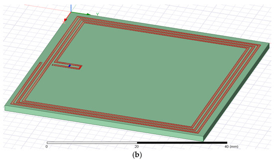 In this study, two circular spiral structures with exterior diameters of 15 mm, w and s values of 0.1 mm, and 7 (Figure 13a) and 12 (Figure 13b) turns, respectively, were considered.