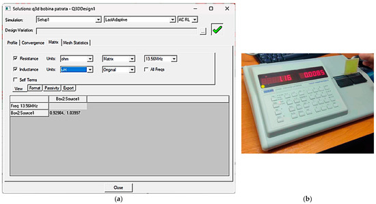 After adapting the model to achieve resonance at 13.56 MHz, a capacitance value of 136 pF and a resistance of 50 Ω were used to be connected in parallel with the planar inductor. The capacitance value calculated analytically using Formula (2) was C = 132.464054 pF. Validation was also performed experimentally to determine the accuracy of the results. The structure was created using the LPFK S103 PCB production line, and its inductance was measured with an RLC Meter (Aim-TTi Glebe Road, Huntingdon, Cambridgeshire PE29 7DR, United Kingdom), as shown in Figure 2.