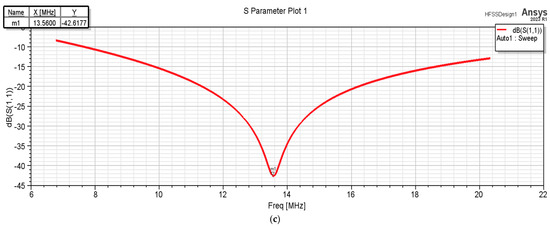 The values of the circuit elements added to the circuit to achieve resonance at 13.56 MHz: (a) the values obtained from numerical modeling; (b) the resonance frequency measured after adding the circuit elements at the tag terminals; (c) the S parameters that confirm the operation of the structure at a resonance frequency very close to the desired value.