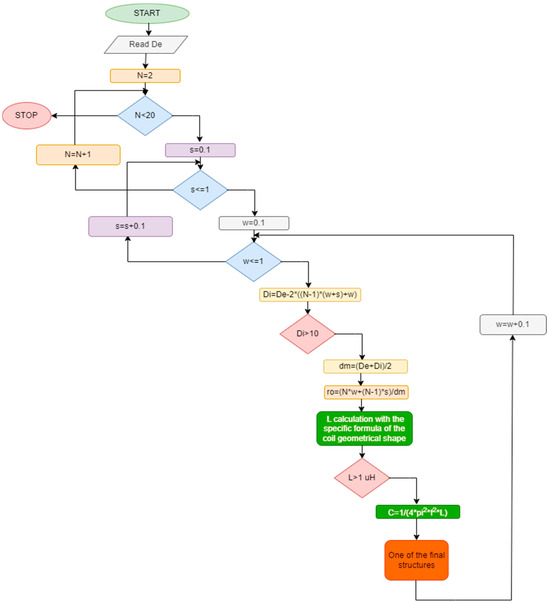 Given the standard dimensions of coils used as tags in RFID and considering their various shapes, as found in the specialized literature, calculation software was designed to generate all possible geometric configurations to model such coils [29]. The logical scheme on which this software is based can be observed in Figure 5.
