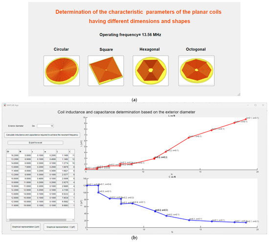In this case, circular, square, hexagonal, and octagonal planar coils were considered. The formulas for calculating the inductance are given as (1), where the coefficients must be considered in accordance with the inductor’s shape.