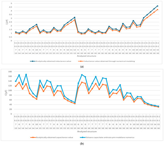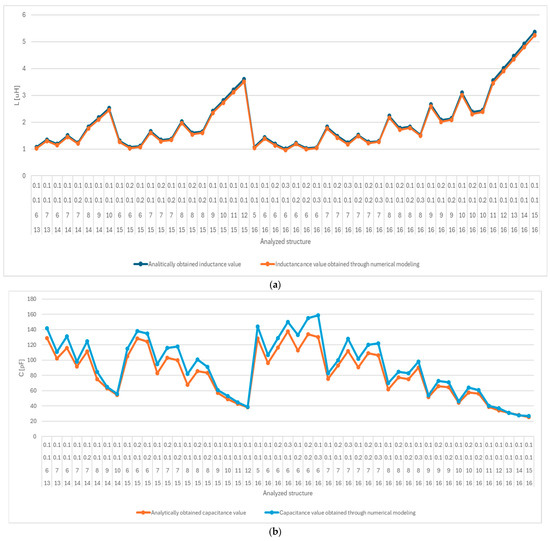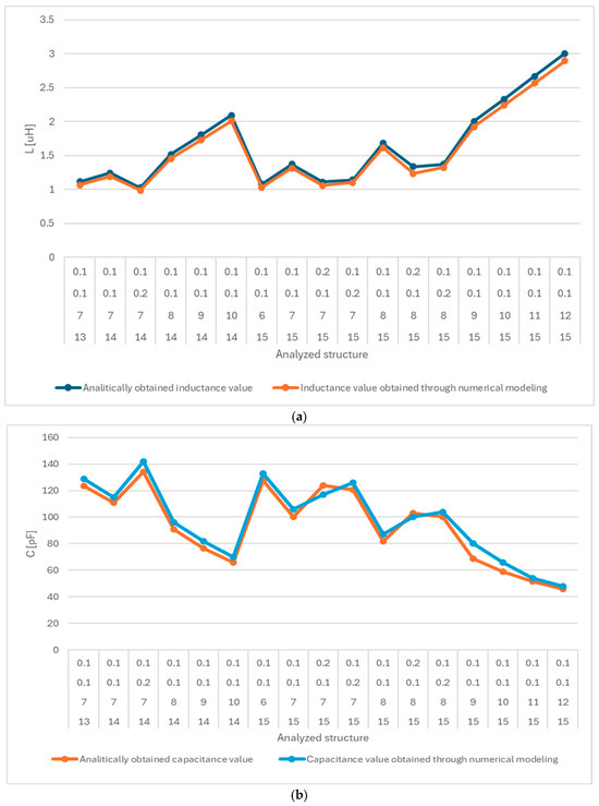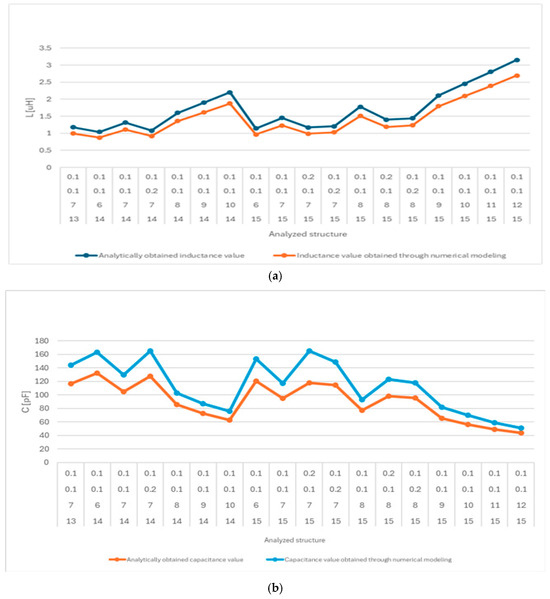 Comparison between the analytical results and the results obtained through numerical modeling for (a) inductance and (b) capacitance.