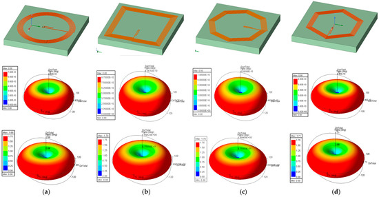 Gain representation of four coil shapes: (a) circular; (b) square; (c) hexagonal; (d) octagonal.