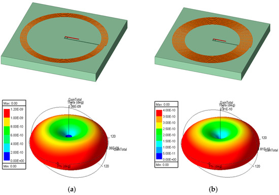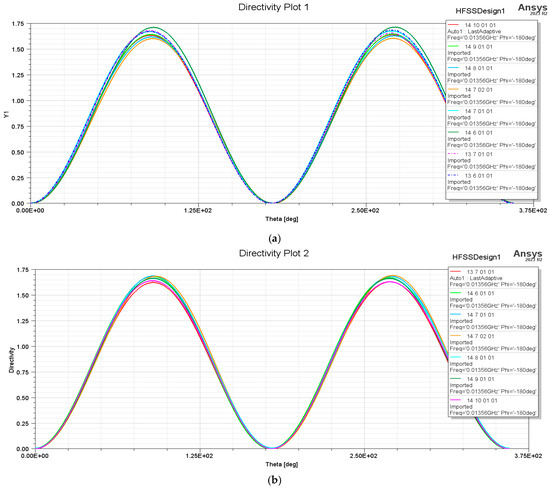Directivity representation of exterior diameters of 13 mm and 14 mm of the square and octagonal spiral-shaped structures: (a) directivity of the square-shaped coil structures; (b) directivity of the octagonal-shaped coil structures.