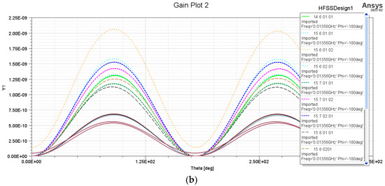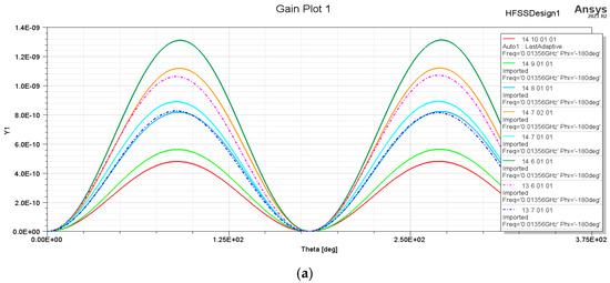 Gain representation of exterior diameters of 13 mm, 14 mm, and 15 mm of the octagonal spiral-shaped structures: (a) gain of the octagonal-shaped coil structures with De = 13 mm and 14 mm; (b) gain of the octagonal-shaped coil structures with De = 15 mm.