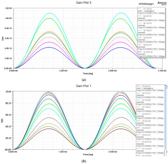 Gain representation of exterior diameters of 13 mm, 14 mm, and 15 mm of the square spiral-shaped structures: (a) gain of the square-shaped coil structures with De = 13 mm and 14 mm; (b) gain of the square-shaped coil structures with De = 15 mm.