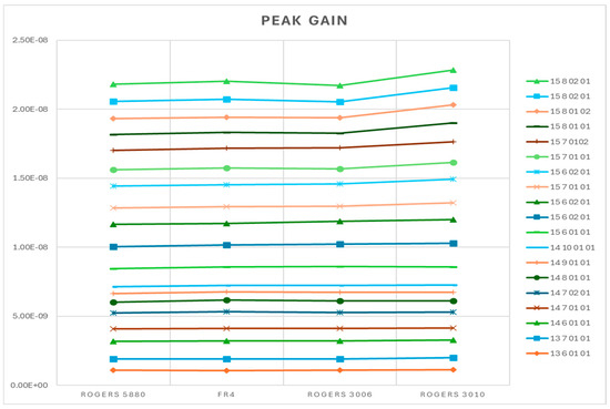 It can be stated that at low frequencies, the dielectrics do not considerably influence the gain of the structures, as can be observed in Figure 17; therefore, a dielectric with a lower price, like FR4 epoxy, was sufficient to achieve our goal.