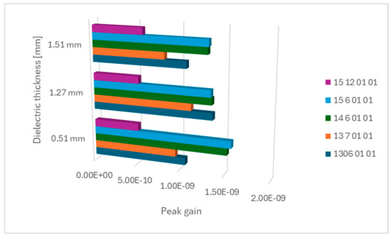When considering the dielectric thickness, it was discovered that it influences the maximum gain of the structures but not in a linear manner; therefore, it is very hard to predict their operation. The influence of three different dielectric thicknesses, namely 0.51 mm, 1.27 mm, and 1.52 mm, is presented in Figure 18.