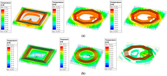 The determined temperatures for the analyzed structures: (a) structures with an exterior diameter of 13 mm and 7 turns; (b) structures with an exterior diameter of 13 mm and 7 turns.