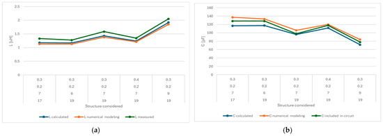 A comparison of the obtained values through measurement, numerical modeling, and analytical calculations of (a) inductivity and (b) capacitance.