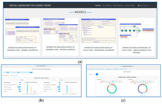 Screenshots of some components of the implemented virtual laboratory: (a) model list page; (b) statistics page for task solutions; (c) error statistics page; (d) best students ranking page.