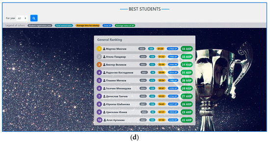 Figure 4a shows the page with the list of developed interactive models that the user can run and solve tasks. Figure 4b shows the page about the statistics of solved tasks, and Figure 4c shows the summary statistics of errors made when solving the tasks. Figure 4d shows the best students ranking page, with a total of 5 rankings available, one general and one for each interactive model.