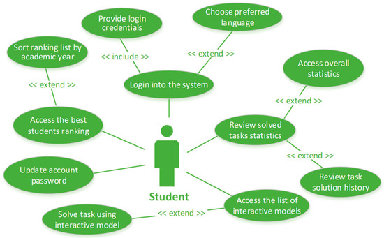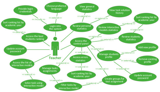 Figure 5 and Figure 6 illustrate the use-case diagrams of the virtual laboratory for students and teachers, respectively. Figure 5 presents the main actions that students can perform on the platform, including logging into the system, accessing the interactive models for solving coding theory problems, viewing their own results and errors, and participating in leaderboards (ranking of the best students). Figure 6 shows the use-case diagram for educators, which includes managing user profiles, setting assignment conditions, monitoring student activity, and generating statistical reports. These diagrams provide a visual overview of the functionalities available to the two main groups of users of the lab, highlighting the interactive and administrative capabilities of the platform.