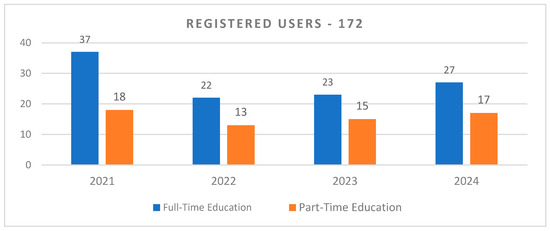 The virtual laboratory is used in the educational process from January 2021 to the present moment (2024). At the time of writing this article, the total number of registered student profiles is 128. Their distribution by years and form of education (full-time and part-time) is shown in Figure 12. Figure 13 shows the distribution of solved tasks with interactive models from the virtual laboratory.