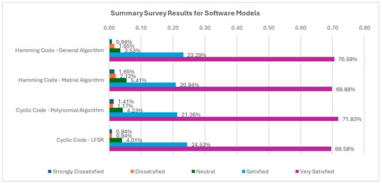 The results of the survey show a high degree of satisfaction with the use of the interactive software models. Analysis of the responses demonstrated that all four models received similar ratings from the respondents. The highest rating of “Very Satisfied” was indicated by approximately 70% of the participants, which highlights the positive perception of the models on all criteria, including interface, ease of orientation, and practical utility. The rating “Satisfied” was received by about 22% of the respondents, while “Neutral” was represented by about 4%. The negative ratings of “Strongly Dissatisfied” and “Dissatisfied” are kept to a minimum, not exceeding 3% in total, which clearly shows that the interactive models are effective and well accepted by students. These results once again confirm the successful integration of software tools into the learning process and their significant role in supporting coding theory learning.