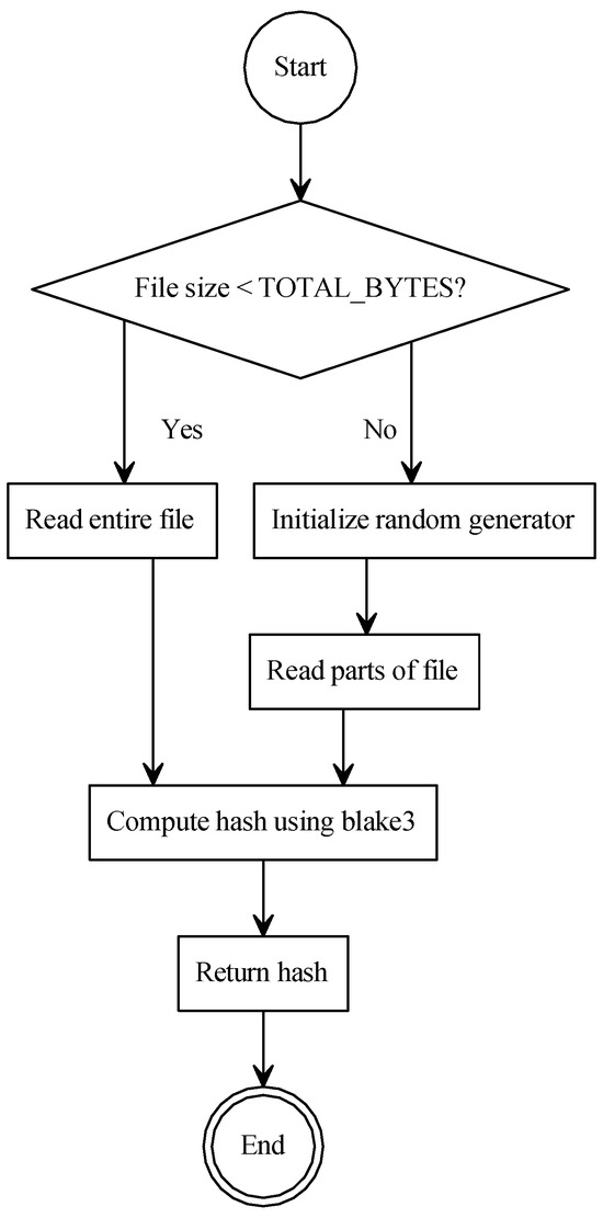 Second is FSH, as depicted in Figure 2 [15]. TOTAL_BYTES are chosen from the file randomly and spread across partitions of size SELECTION_SIZE. Following that, the randomly chosen bytes are concatenated and then hashed, resulting in a single hash but only reading TOTAL_BYTES bytes from any file, regardless of its size. If the file is smaller than TOTAL_SIZE, the entire file is hashed in a manner similar to the full hashing method.