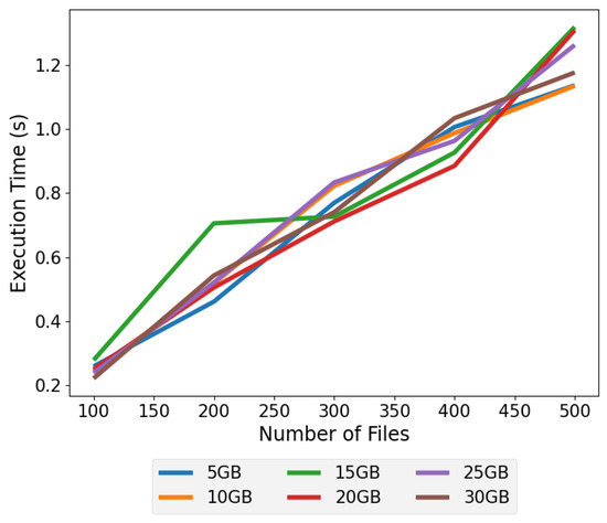 Figure 6 shows the SPH performance, which is comparable to that of FSH seen before with the added benefit of a better descriptive capability. SPH (as visualized in Figure 3) returns a list of hashes, with each describing the state of changes in different portions of the affected file. We think this technique has the highest potential, and with more research and optimization, it can become a highly performant litmus test to stop ransomware and maximize file recovery rates. As demonstrated in Figure 6, the maximum execution time was about 1.3 s for hashing 30 GB of 500 files.