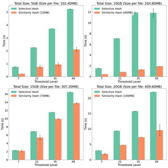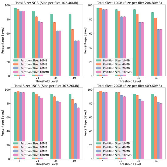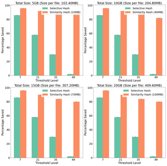 Second, tests were conducted to compare the partition sizes of the SPH algorithm. Figure 9 shows the difference in the percentage of files saved across the four partition sizes. It is intuitive that smaller partition sizes have better (i.e., less) detection times. However, it should be mentioned that the partition size is correlated to the file size. If the partition size is greater than or equal to the file size, then SPH performs the same as FSH. In all test figures, the threshold value was tested. It is clear that smaller thresholds perform better in terms of the percentage of files saved and the detection speed. However, this means that more partitions have to be hashed. The partition size and the threshold value are configurable parameters that can be set by the user. Those two parameters affect the false positive rate, the false negative rate, the detection time, the percentage of time saved, and the time required to scan through the complete file list. This is elaborated in Section 4.4.