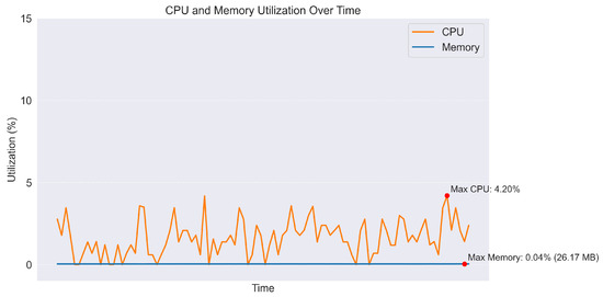 Throughout the benchmarking tests, both the CPU and memory utilization for SPH were recorded periodically to assess the impact of the detection system on the computer. Figure 10 shows the CPU and memory utilization for SPH with 10MB throughout all file sizes. These configurations were chosen since they generate the largest number of hashes per file and, therefore, would provide a worst-case scenario for the system. Let us elaborate; the metrics were sampled at every iteration, which is a full loop through the tracked files. It can be seen that there is little to no impact on system resources, with CPU utilization being mostly constant across the run and peaking at 4.2%. As for memory utilization, the highest is 0.04% (26.17 MB). Finally, it should be noted that these metrics were recorded while the ransomware was running simultaneously to mimic a real use case for the system.