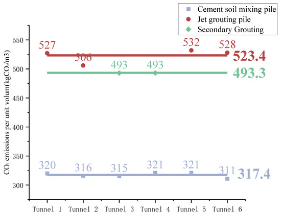 | Tunnel reinforcement | Cement soil mixing pile | CO2 emissions per unit volume | 317 | 1.90% |