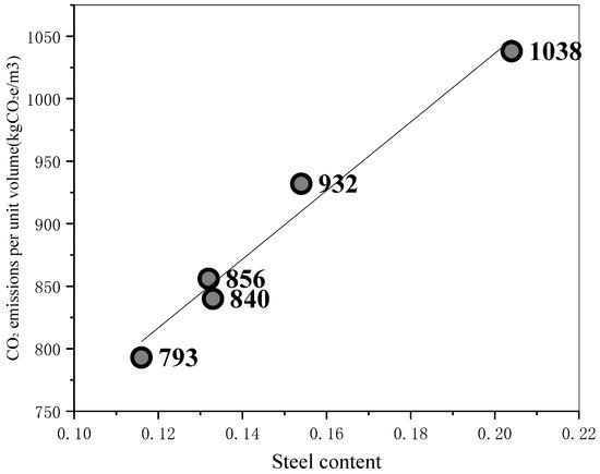 | Internal structure | Concrete structures | CO2 emissions per unit volume | y = 2735.5x + 488.48 (y-value, x-Steel content) | 2.40% |