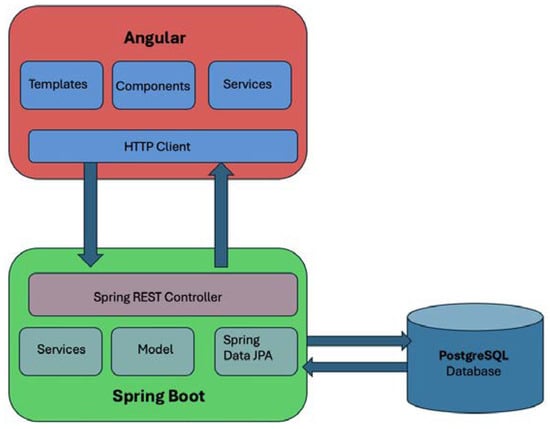 The frontend of the system uses Angular [24], a framework for building single-page applications. It employs a component-based architecture [25], allowing for reusable and modular code. Key Angular features include data binding [26], dependency injection [26], routing [25], reactive programming [25], and robust testing support [26]. The frontend manages modules such as user authentication and timetable display, interacting with backend application programming interfaces (APIs) to retrieve data and update the application’s status, guaranteeing a user interface that is dynamic and responsive.
