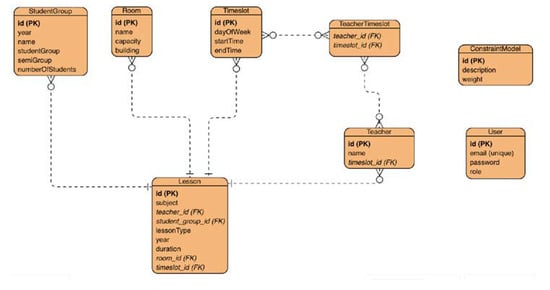 Implementing load balancing [59] will enhance the system’s performance, particularly when handling large datasets or multiple simultaneous users. An automated way to retrieve rooms, timeslots, student groups, teachers, and lessons (e.g., via Excel) will be added, streamlining data entry processes and ensuring accuracy. Furthermore, a feature to export the generated timetable will be included. Current issues related to the implemented constraints and updating entities using Spring JPA will be addressed to enhance overall system performance and accuracy.