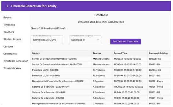 The low medium constraint score can be related to the limited access to information from course lecturers, excluding those who teach seminars or laboratories. The assumption that these lecturers also teach the course, seminar, and laboratory was adopted. Despite imposing the constraint that a professor could not teach more than 12 h per day, the system recorded instances where a professor was allocated 13 or 14 h of lecture, resulting in scores of −1 and −2 accordingly. This also applies to student groups that are limited to 10 h of instruction per day. Furthermore, the implementation of the constraints considering teachers’ preferences lacks precision. Instead of assigning estimated periods during which each teacher can teach, we assigned specific time slots. This leads to instances where a teacher is allocated to a time slot that he is unavailable for, despite being capable of teaching during that time without any difficulty.