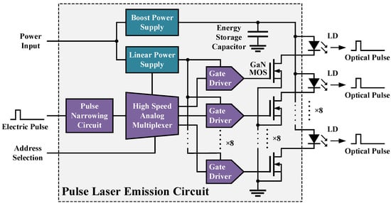 LiDAR is a sensor module that detects the spatial position and distance of targets by emitting laser beams. In recent years, with the rapid development of autonomous driving, smart homes, machine vision, and other fields, the attention given to LiDAR has been increasing year by year [1,2,3,4]. Currently, the commonly used light source for the light-emitting module of LiDAR is the semiconductor laser diode (LD). A LD has the characteristics of small sizes, low costs, convenience, and is widely used in optoelectronic products [5,6,7,8]. Especially in the fields of optical communication and optical measurement, it is the main component for converting electrical signals at the transmitting end into optical signals. In the field of laser communication, semiconductor laser diodes are the main components for converting electrical signals at the transmitting end into optical signals, and almost all optical transmitters use LDs [6,9,10,11]. In the field of optical measurement, the LD is widely used in laser ranging, laser scanning, and LiDAR [6,12,13,14]. In recent years, due to the rise of autonomous driving technology, LiDAR has become a research hotspot in the field of measurement. The LD drive circuit is a key technology that affects the detection distance, detection resolution, and scanning rate of LiDAR, and is an important component of the LiDAR system. Pulse LiDAR obtains measurement distances by measuring the time interval between the laser emission signal and the laser echo signal, and usually uses a time-to-digital converter (TDC) for TOF measurement [15,16,17]. As the core circuit in TOF LiDAR, the design of the pulse laser emission circuit is particularly important. High-power pulse lasers can achieve long-distance measurement, but to ensure the safety of human eyes, the average output power of the laser needs to be limited. To increase the measurement distance and ensure the safety of human eyes, it is necessary to increase the pulse laser emission power while reducing the pulse width.