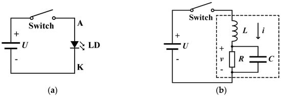 As shown in Figure 2b, when the switch is turned on, Equation (1) can be written according to Kirchhoff’s law, resulting in a second-order differential equation for the voltage vON across the LD.