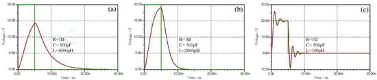 Figure 3 shows the simulation curves of the pulse responses of vON and vOFF at both ends of the LD when different values of R, L, and C are set. The switch conduction time is set to 5 ns, and the power supply voltage is set to 20 V. In Figure 3a, R = 1 Ω, C = 500 pF, and L = 4000 pH are set, which means L > 4R2C. It can be seen that the response pulse has one peak, the peak value of the pulse is less than 20 V, indicating a large output pulse attenuation, and that the voltage decay duration after the switch is turned off is relatively long. In Figure 3b, R = 1 Ω, C = 500 pF, and L = 2000 pH are set, which means L = 4R2C. It can be seen that the response pulse has one peak, with a similar waveform shape to that in Figure 3a, but the peak value of the pulse is close to 20 V, and the voltage decay duration after the switch is turned off is relatively short, showing a better effect than Figure 3a. In Figure 3c, R = 1 Ω, C = 500 pF, and L = 100 pH are set, which means L < 4R2C. It can be seen that the response pulse oscillates, and the peak value of the pulse exceeds the power supply voltage of 20 V. The output pulse width is less than 5 ns, and the voltage rapidly drops and oscillates after the switch is turned off. By reasonably controlling the values of R, C, and L, we can control the oscillation amplitude and decay time. To obtain higher output pulse voltages and narrower output pulse widths, we need to operate the LD in the mode shown in Figure 3c. We can adjust the R, C, and L parameters by connecting an inductor in series or a capacitor in parallel next to the LD.