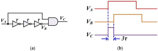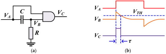 Figure 4 shows the schematic diagram and signal timing diagram of the RC pulse narrowing circuit, which consists of capacitors, resistors, and an AND-gate. When the signal VA generates a pulse, the capacitor C starts charging; due to the charging of the capacitor, the voltage of signal VB decreases, eventually dropping to a low level. When the signal VB drops from a high level to the threshold level of the AND-gate, the signal VC drops from a high level to a low level, and the pulse width can be calculated using Equation (6).