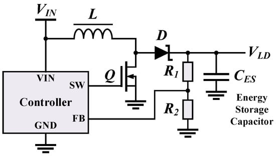 In Figure 6, the capacitor CES also serves as an energy storage capacitor. The high-power pulse of the pulsed LD is achieved by utilizing the instantaneous discharge of the capacitor to provide a large current. Here, we conduct some theoretical calculations. Assuming the output voltage of the boost circuit is 20 V, and a 30 A, 5 ns pulse current is required to be provided to the semiconductor LD, the required charge quantity is as follows: