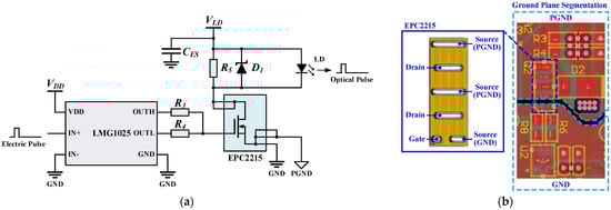 Figure 7a illustrates the schematic diagram of the laser diode pulse drive circuit. In the figure, LMG1025 is a high-speed gate driver from Texas Instruments (TI), capable of achieving an extremely fast propagation delay of 2.5 ns and a minimum pulse width of 1 ns. The IN+ pin of the LMG1025 serves as the positive input pin for the pulse signal, with the signal originating from the output of the pulse narrowing circuit. The output terminals OUTH and OUTL of the LMG1025 are connected to the gate of the GaN MOSFET switch EPC2215 via 0 Ω resistors. The MOSFET utilizes the GaN field-effect transistor EPC2215 from Yipu Energy Conversion Company (EPC). GaN field-effect transistors exhibit higher switching speeds compared to silicon field-effect transistors, making them ideal for high-speed switching applications [37]. Figure 7b shows the layout of a portion of the printed circuit board (PCB) for the drive circuit. Due to the high current generated during the conduction of the GaN MOSFET, a transient voltage fluctuation may occur on the ground plane, which can couple into the gate of the MOSFET, preventing it from fully conducting. Therefore, it is necessary to segment the circuit’s ground plane, separating the power ground (PGND) and signal ground (GND) layouts. As shown in Figure 7b, the source of EPC2215 has three electrodes, with two sources connected to the PGND and one source connected to the GND. Inside the EPC2215 chip, both the PGND and GND are connected to the source, achieving common grounding. This prevents the impact of high currents on the PGND, which could cause a potential rise on the GND. A Schottky diode D1 is used to suppress the back electromotive force. The resistor R5 can quickly discharge the charge in the semiconductor LD, thereby accelerating the turn-off speed. Additionally, when the circuit is not operating, it connects the positive and negative terminals of the semiconductor LD together, preventing the PN junction from being broken down due to external static electricity, thus protecting the semiconductor LD. The capacitor CES is soldered near the semiconductor LD, serving the functions of filtering and energy storage. We have chosen 0 Ω for R3 and R4, 4.7 Ω for R5, and 100 μF for CES in the circuit. When the operating voltage of the pulse LD we selected is 18 V, the peak power of the output pulse light can reach 75 W, so the VLD is set to 18 V.
