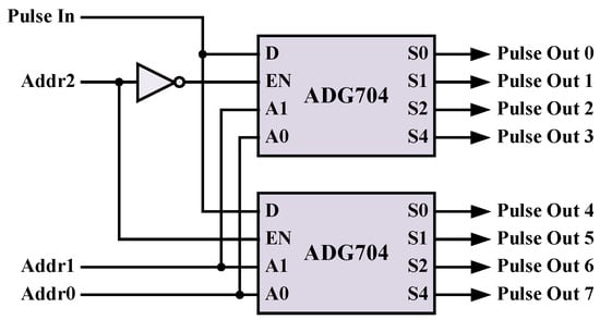 Figure 8 is a circuit schematic diagram of a multiplexer, which utilizes two 4-channel multiplexer chips ADG704 from Analog Devices (ADI) (Wilmington, MA, USA) to drive an 8-channel LD. One input pulse signal (Pulse In) can be output as 8 pulse output signals (Pulse Out 0~Pulse Out 7). The NOT-gate is used to select the two ADG704 chips and form a 3-bit address (Addr2, Addr1, Addr0) together with the address pins of ADG704. Controlling the voltage levels of these three pins can determine the output channel. Since the channel switching speed of ADG704 is less than 50 ns, fast switching within a 50 ns range can be achieved.