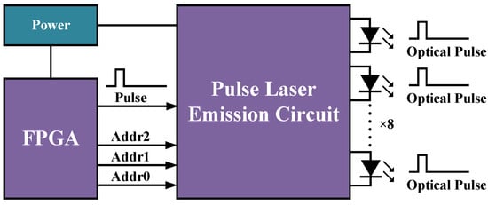 Figure 9 is a schematic block diagram of the scanning test circuit, which consists of a pulsed laser emission circuit, a FPGA, and a power supply. The FPGA outputs three-bit addresses (Addr2, Addr1, Addr0) to sequentially select 8 LDs to output optical pulses. The three-bit address signals are switched in sequence from 000, 001, 010, 011, 100, 101, 110, and 111. Each time an address is switched, the FPGA outputs a pulse to the pulsed laser emission circuit. Setting the switching frequency of the three-bit address signals to 1 MHz, the time to complete one scan is 8 μs, and the emission frequency of each LD is 125 kHz.