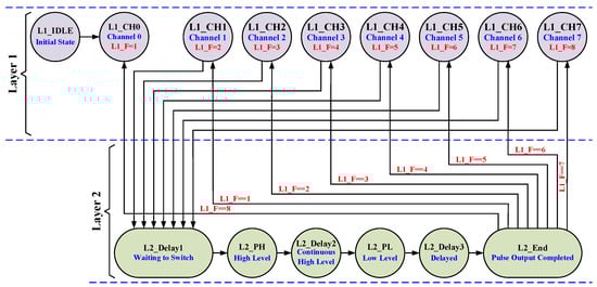 Figure 10 is a state transition diagram of the FPGA test signals, implemented using a two-layer state machine model. The states of the first layer include L1_IDLE (initial state), L1_CH0 (channel 0), L1_CH1 (channel 1), L1_CH2 (channel 2), L1_CH3 (channel 3), L1_CH4 (channel 4), L1_CH5 (channel 5), L1_CH6 (channel 6), and L1_CH7 (channel 7). In each channel state, a three-bit address (Addr2, Addr1, Addr0) is output to select the output channel. L1_F is a state transition flag that changes during each channel state to jump to the second layer state. The states of the second layer include L2_Delay1 (delay, waiting for channel switching to stabilize), L2_PH (pulse output at a high level), L2_Delay2 (delay, pulse at a high level for a period of time), L2_PL (pulse output at a low level), L2_Delay3 (delay), and L2_End (pulse output ends, jumping to the channel state of the first layer). The state machine cycles through these states to achieve a pulse output for each channel.