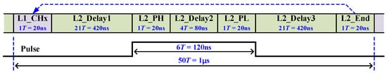 Figure 11 shows the timing diagram of the FPGA pulse output signal. The state machine of the FPGA is driven by a 50 MHz clock signal, with a cycle T of 20 ns. The state L1_CHx (x = 0, 1, …, 7) remains for 1T, which is 20 ns. The state L2_Delay1 remains for 21T, which is 420 ns. The state L2_PH remains for 1T, which is 20 ns. The state L2_Delay2 remains for 4T, which is 80 ns. The state L2_PL remains for 1T, which is 20 ns. The state L2_Delay3 remains for 21T, which is 420 ns. The state L2_End remains for 1T, which is 20 ns. In one cycle, there are a total of 50T, which is 1 μs. During the periods of L2_PH, L2_Delay2, and L2_PL, pulses are output with a pulse width of 6T, which is 120 ns. That is, the FPGA outputs pulses with a frequency of 1 MHz and a pulse width of 120 ns. During the periods of L1_CHx and L2_Delay1, channel switching is implemented, with a duration of 22T, which is 440 ns.