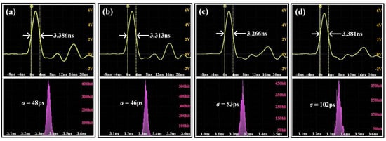 Next, we measured the pulse width and jitter of the eight channels of pulses output by the multiplexer. As shown in Figure 13, the pulse widths of channels 1, 2, 3, and 4 displayed on the oscilloscope were 3.386 ns, 3.313 ns, 3.266 ns, and 3.381 ns, respectively. Table 1 displays the pulse widths of all eight channels, all of which are less than 5 ns. Figure 13 also shows the histogram distribution of the pulse widths of these four channels, with each channel measured 5000 times. The standard deviations of the pulse width jitter for the four channels are 48 ps, 46 ps, 53 ps, and 102 ps, respectively. Table 1 displays the standard deviations of the pulse width jitter for all eight channels, which generally do not exceed 102 ps. The pulse jitter standard deviation is less than 3% of the pulse width, indicating that both the pulse width and stability meet the design requirements.