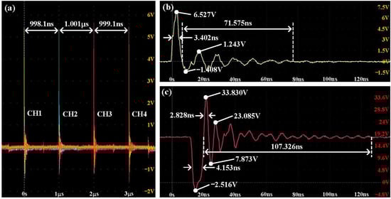Figure 14a illustrates the pulse timing sequence for channels 1, 2, 3, and 4. The phase difference between channels 1 and 2 is 998.1 ns, that between channels 2 and 3 is 1.001 μs, and that between channels 3 and 4 is 999.1 ns. This indicates a channel switching time of 1 μs. The pulse emission frequency is 1 MHz, and the emission frequency of the same LD is 125 kHz. Figure 14b shows that the gate driver output pulse width of channel 1 is 3.402 ns, with the peak value of the first positive pulse being 6.527 V, the peak value of the first negative pulse being −1.408 V, the peak value of the second positive pulse being 1.243 V, and a pulse oscillation decay time of 71.575 ns. Due to the influence of the external circuit on the pulse waveform of the LD, it is impossible to directly measure the current of the LD. Therefore, we indirectly measure the voltage across the LD by measuring the change in the drain voltage of the GaN MOSFET. As shown in Figure 7, the voltage across the LD is obtained by subtracting the drain voltage of the GaN MOSFET from the power supply voltage VLD of the LD. According to the chip manual of the LD, when the voltage is 18 V, the peak power of the output pulse light is 75 W. Therefore, when the drain voltage of the GaN MOSFET is less than 0 V during conduction, the output power of the LD can reach 75 W. Figure 14c shows the drain voltage pulse of the GaN MOSFET in channel 1. This pulse is a negative pulse with a pulse width of 4.153 ns. Since it operates in the mode shown in Figure 3c, the pulse will oscillate. The peak voltage of the negative pulse is −2.516 V, which can ensure that the pulse power of the LD exceeds 75 W. The peak value of the second negative pulse is 7.873 V, the peak value of the first positive pulse is 33.830 V, the pulse width is 2.828 ns, the peak value of the second positive pulse is 23.085 V, and the pulse oscillation decay time is 107.326 ns. The above measurement results are fully consistent with the description in Figure 3c.
