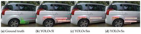The YOLOv5 framework allows for fine-tuning of the model in different depths such as YOLOv5n (1.9 million parameters), YOLOv5s (7.2 million parameters), YOLOv5m (21.2 million parameters), YOLOv5l (46.5 million parameters), and YOLOv5x (46.7 million parameters). Although the differences between the previous models include the depth of the network and its number of parameters, we have found that we can take advantage of the joint inference of the aforementioned models because the behavior of each model varies enough with respect to the other models to locate new damage. However, they usually maintain similar predictions, allowing them to reinforce the presence of possible damage. The variability in the predictions can be seen in Figure 2. For this reason, we have chosen to train YOLOv5 from version n to x, with input sizes of (640 × 480) and (1280 × 960).